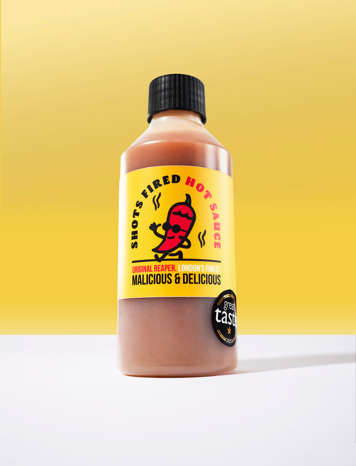 The main ingredient in Shots Fired is the Carolina Reaper chilli- one of the hottest in the world. The carefully balanced recipe means the sauce celebrates the taste of the chilli without being overwhelmingly hot.